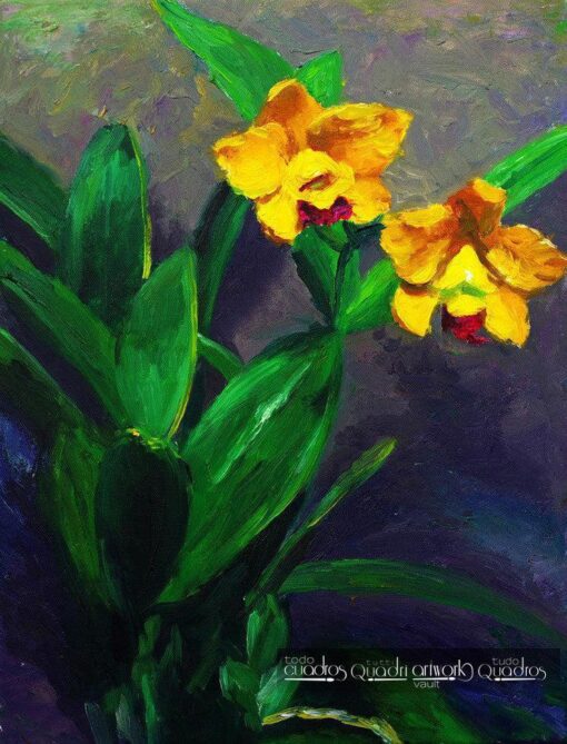 Cuadro de Flores botón de oro, los altos contrastes entre amarillos y azul marino de la obra, la hacen una pieza genial para una decoración elegente, mejor en espacios amplios y bien iluminados.
