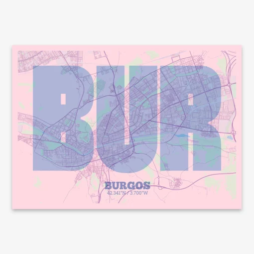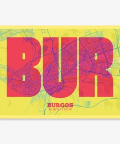 Personalize this Burgos Poster V02, designed with a composition of the map of Burgos and the letters BUR or purchase it with this graphic design ready to add to your cart. A special gift to decorate the walls of lovers of graphic design and typography.