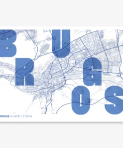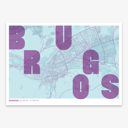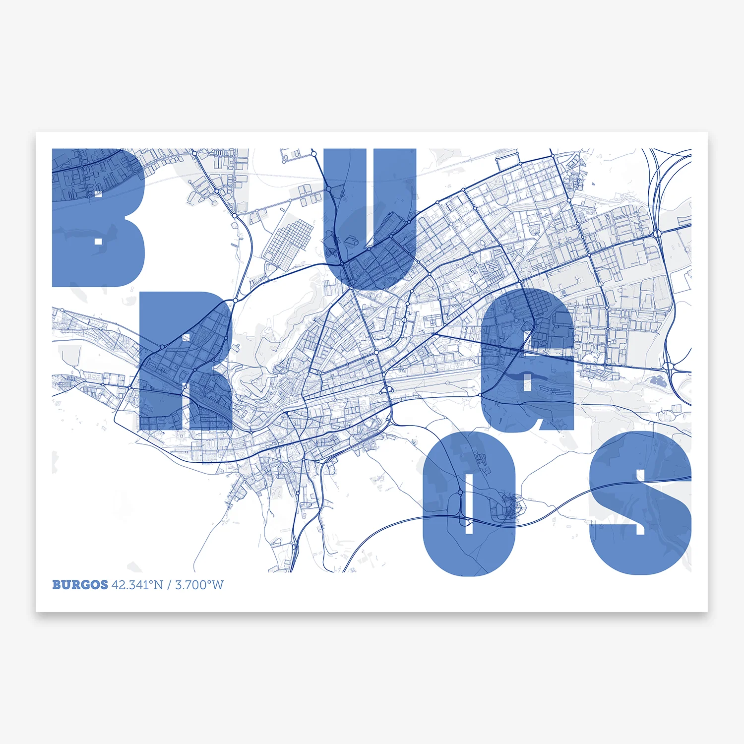 Personalize this Burgos Poster V08, designed with a composition of the map of Burgos and the letters of its full name. Perfect for decorating any corner of your home and taking a little piece of this city with you. A cool gift to decorate the walls of lovers of graphic design and typography.