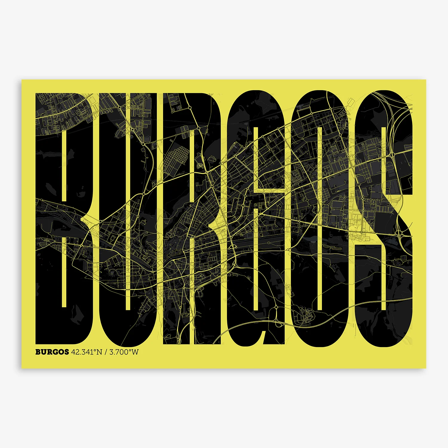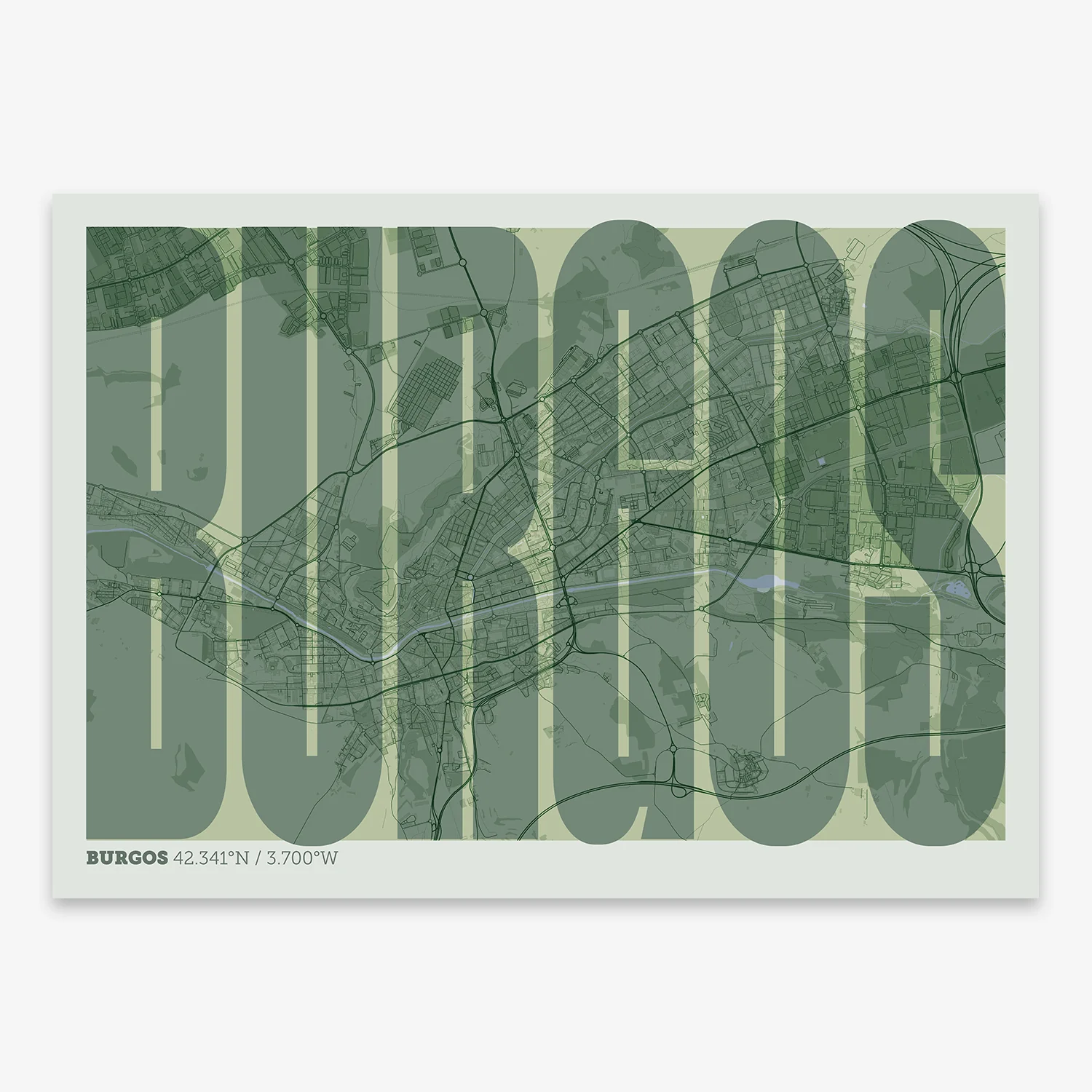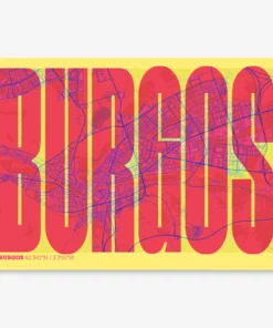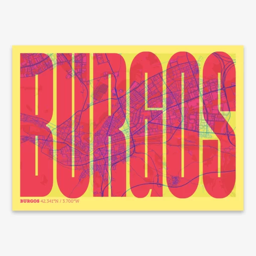 Personalize this Burgos Poster V09, designed with a composition of the map of Burgos and the letters of its full name. Perfect for decorating any corner of your home and taking a little piece of this city with you. A cool gift to decorate the walls of lovers of graphic design and typography.