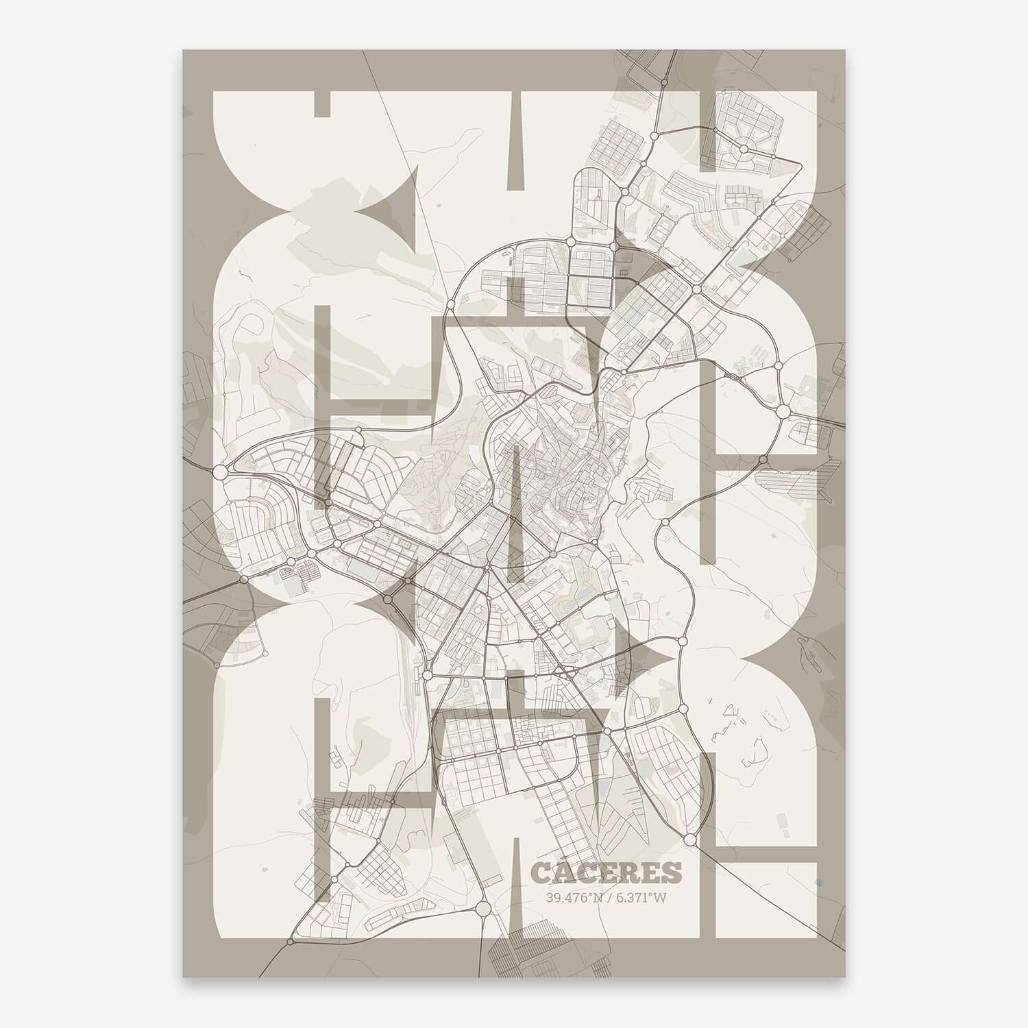 Personalize this Caceres Poster V03, designed with a composition of the map of Caceres and the letters CAC or purchase it with this graphic design ready to add to your cart. A special gift to decorate the walls of lovers of graphic design and typography.