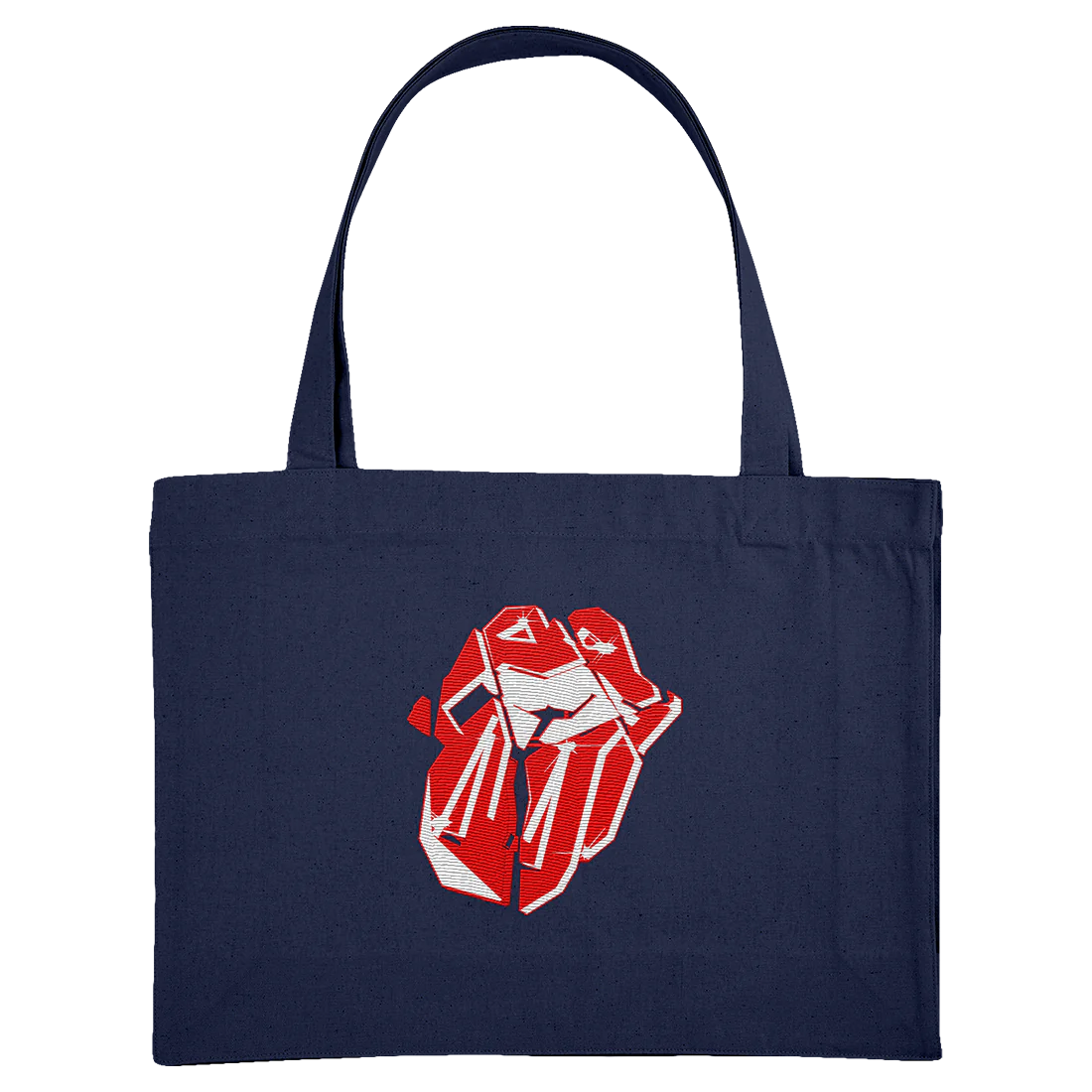 ¡Llévalo contigo! El bolso tote Diamond Tongue presenta el nuevo logotipo de la lengua de Hackney Diamonds impreso en un bolso tote azul.