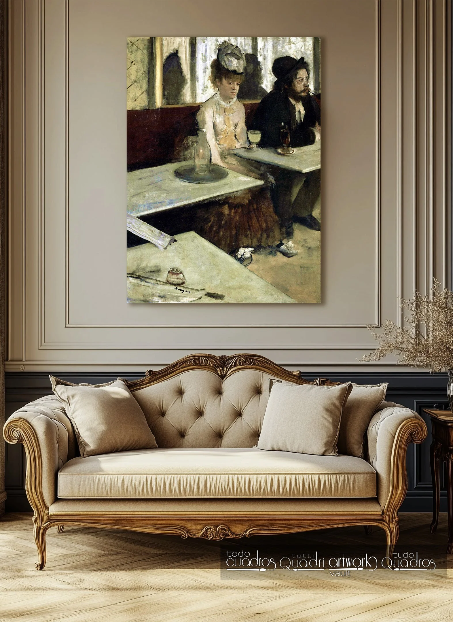 Retrato doble con toda la estética de la época que muestra a dos personajes con aspecto de desconocidos, la mujer con la vista perdida en la nada y el hombre mirando hacia otro lado. Ella en frente tiene lo que se asume es un vaso lleno de absenta, bebida que en aquel tiempo tenía una pésima fama, relacionada con llevar a las personas a la psicosis.