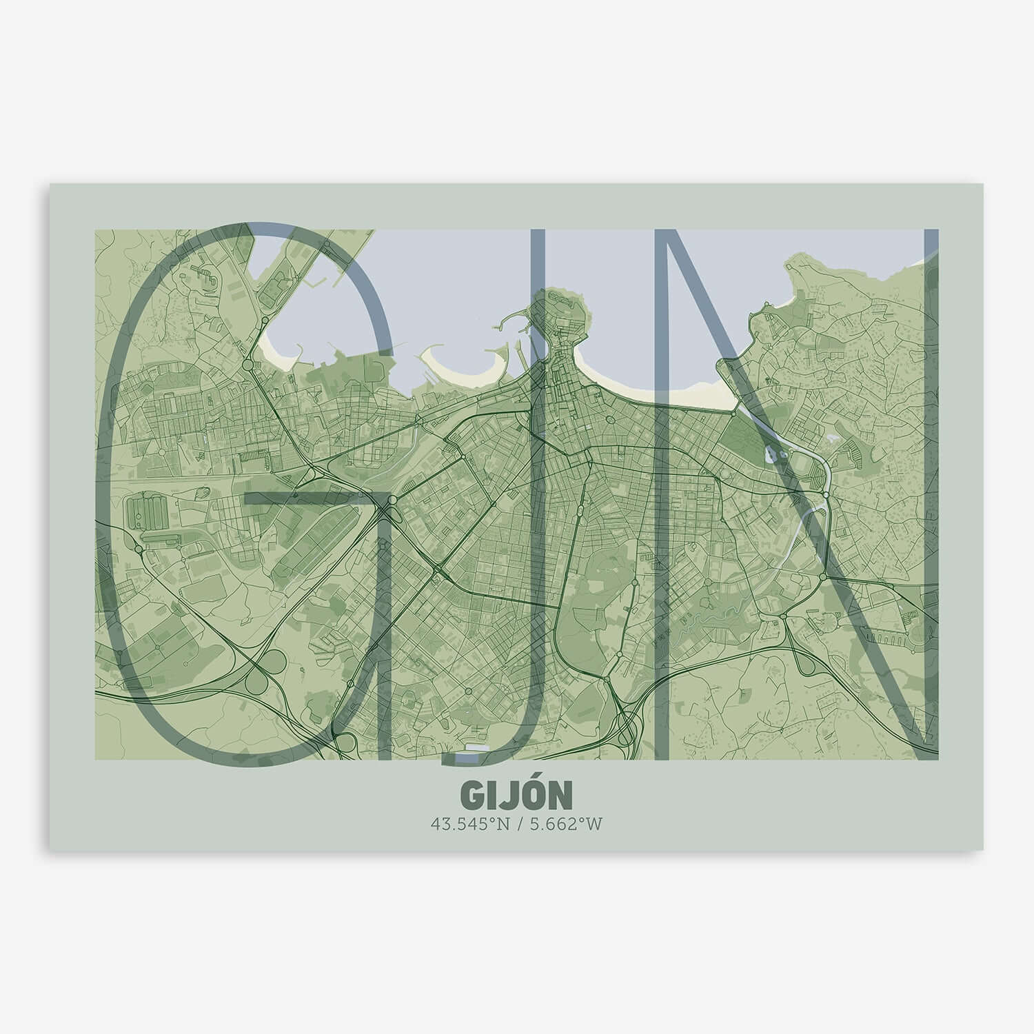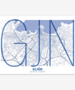 Personalize this Gijon Poster V07, designed with a composition of the map of Gijon and the letters GJN or purchase it with this graphic design ready to add to your cart. A special gift to decorate the walls of lovers of graphic design and typography. Customize it with your own texts if you want to change them.