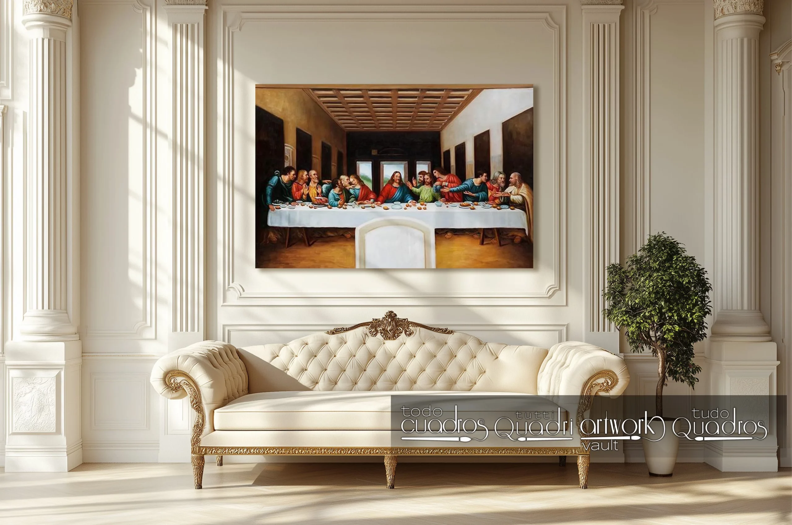 La última cena de Leonardo da Vinci es un cuadro religioso pintado sobre la pared de una iglesia. El original de esta obra corresponde a un fresco de 8,8 x 4,6 m. Pintado sobre gesso (mezcla de yeso y tiza) entre 1495 y 1497 en el convento Santa María de las Gracias, Milán, Italia. Ya que el estado de conservación de la pintura original no permite ver bien los detalles. Es la propia interpretación de nuestros artistas, con la pericia, destreza y profundo conocimiento del estilo de Leonardo, la que nos permite ofrecer una reproducción de esta obra que dejara al espectador realmente satisfecho de poder apreciar desde tan cerca una pintura que a veces parece estar tan lejos.
