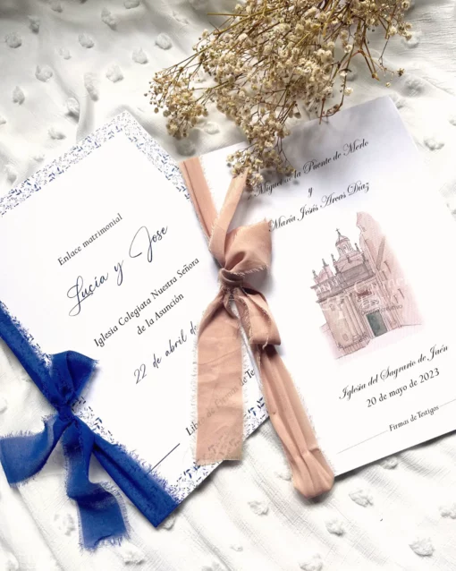 Los testigos firmarán y dejarán testimonio de este día tan especial. El precio incluye la personalización de la portada con acuarela digital y lazo de seda natural a elegir color