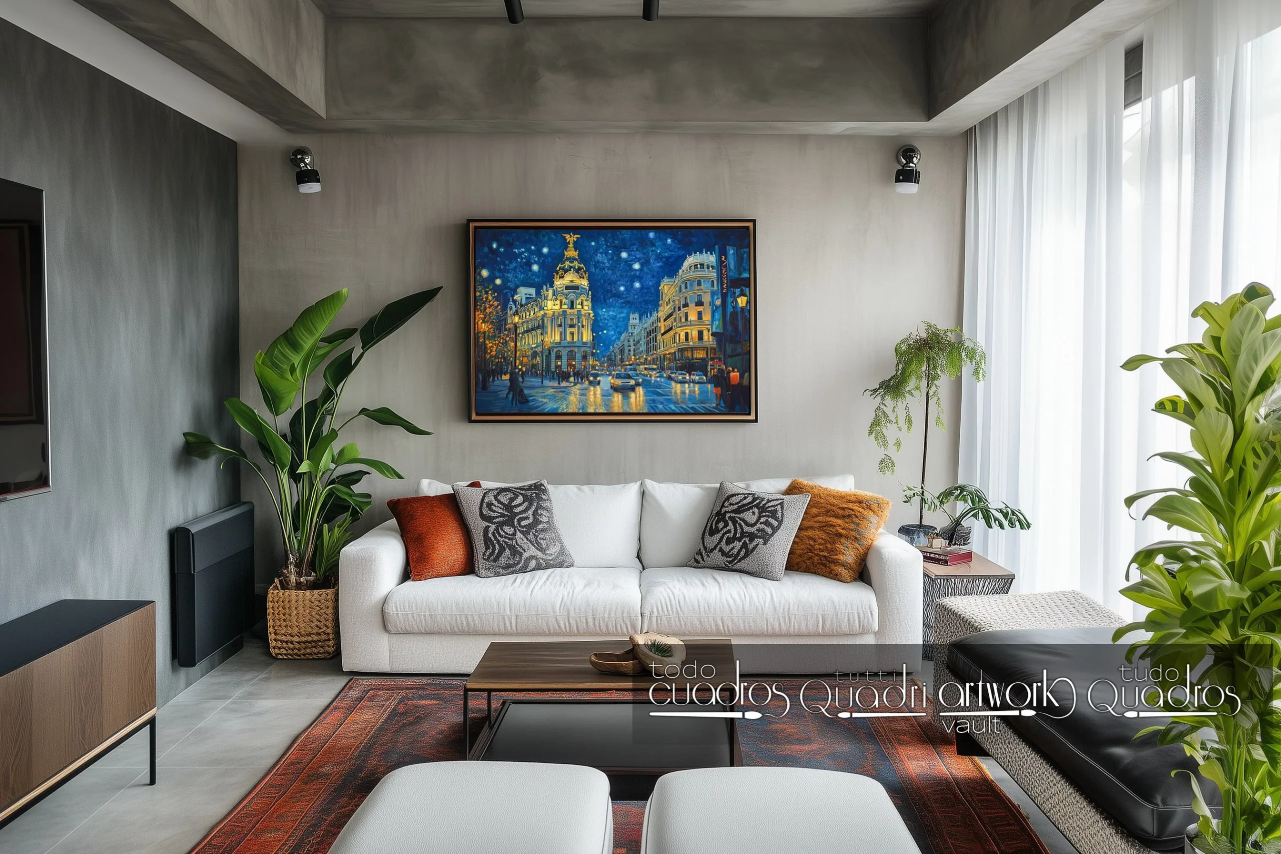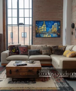 Este óleo inspirado en el estilo de Vincent van Gogh, presenta una vista nocturna en la Gran Vía de Madrid. Los trazos gruesos, enérgicos, cortos y curvos de la pintura, conforman una pieza que fusiona lo clásico y lo moderno en una escena urbana contemporánea.
