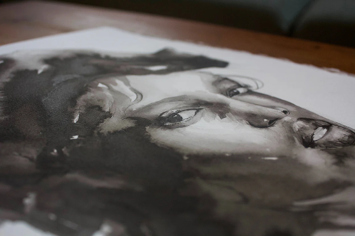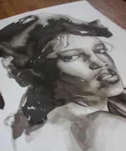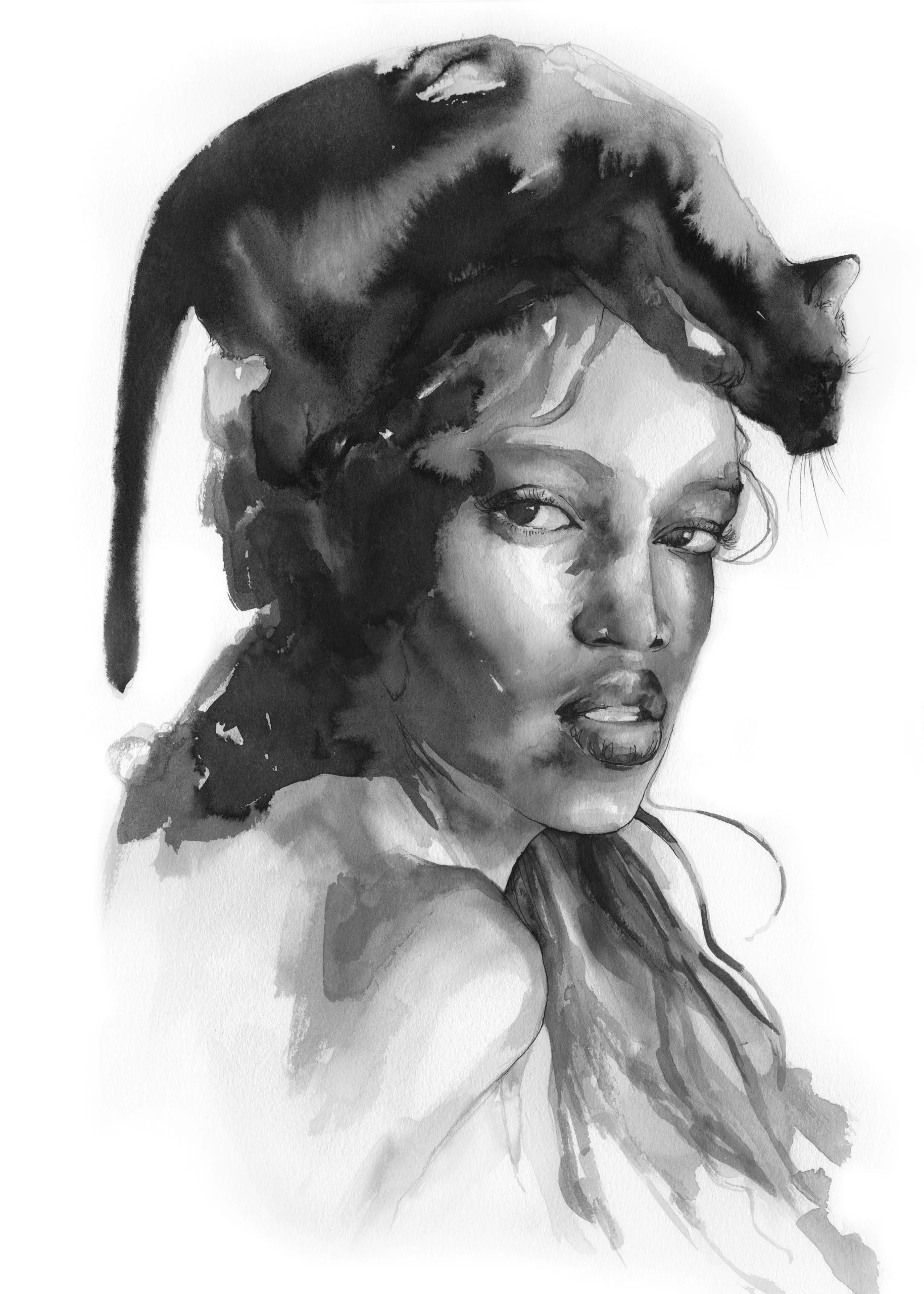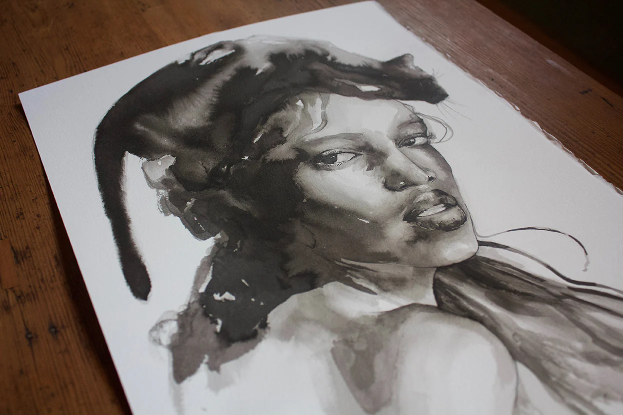 Lámina pintada en tinta china. La serie Black nos habla de doce espíritus felinos que se manifiestan en forma de mujer dando voz a la belleza negra.
