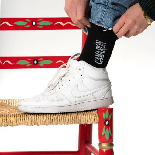Set de 3 pares de calcetines de caña media blancos, negros y rojos con detalles del logo y la silueta de Camarón de la Isla.