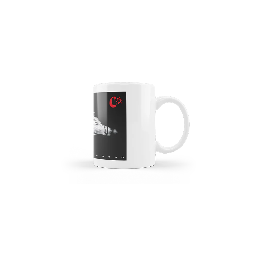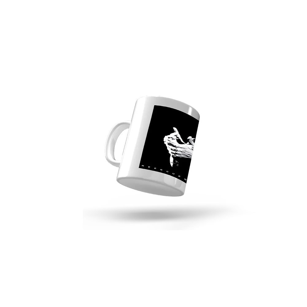 Taza blanca con diseño fotográfico inspirado en la portada del álbum de Camarón: El Reencuentro y logotipo rojo en la esquina superior izquierda.